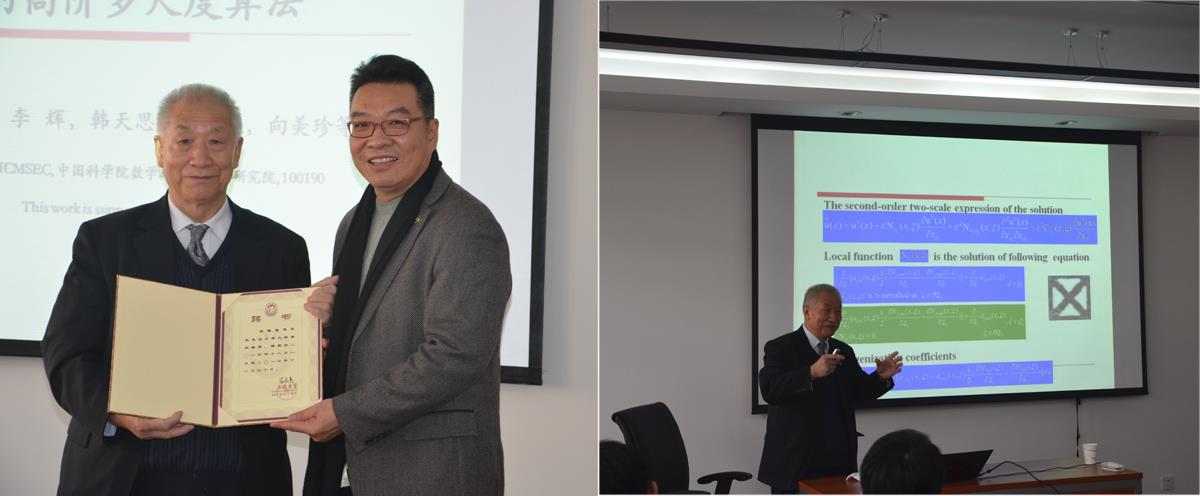 聘任仪式后,崔院士为我校师生作了题为“原子-连续关联模型及从微观到宏观的高阶多尺度算法”的学术报告。崔院士的报告深入浅出地介绍了原子-连续关联模型(ACC)产生及应用,包括基于连续模型高阶多尺度方法、在微纳米尺度ACC模型的动力学行为及其算法等。报告中,崔院士总结了最近十几年研究工作的思路,提出了原子连续关联模型,用不断局部化的思想,研究材料从微观到宏观跨尺度不同层次的性质,从微观、介观、宏观,从基础研究到工程应用给出了一个精彩的报告。崔院士指出,目前正在进行原子连续关联模型的程序化,相信不久,新的软件集成系统将会推动材料学的快速发展。